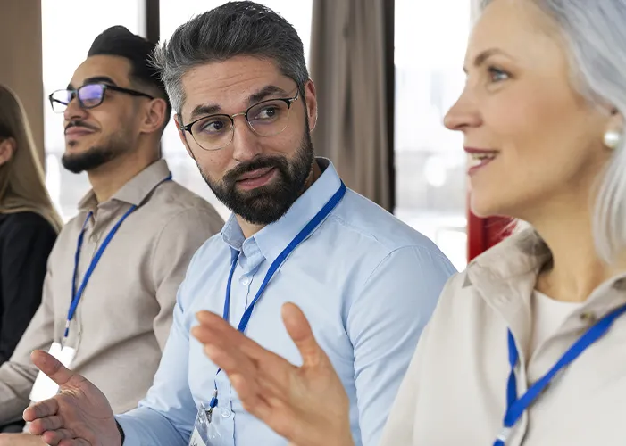 Homem de braços cruzados com cracha de expositos sobre um fundo verde de estande de feira